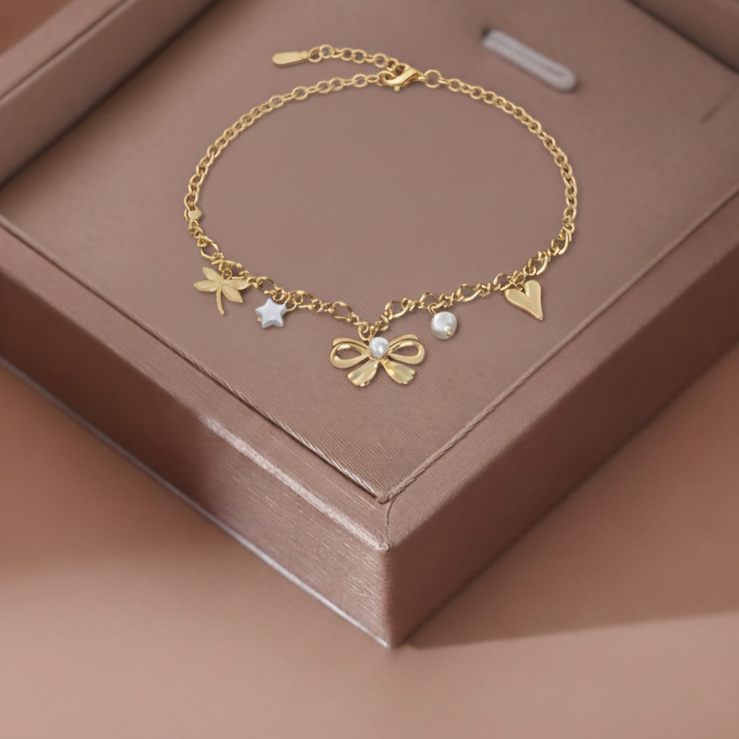 The Aurora Charm Bracelet is a delicate blend of playful charm and everyday elegance. Designed with a fine gold-tone chain, this bracelet features thoughtfully placed charms—a bow, heart, star, pearl accent, and dragonfly—creating a soft, feminine look with subtle movement.