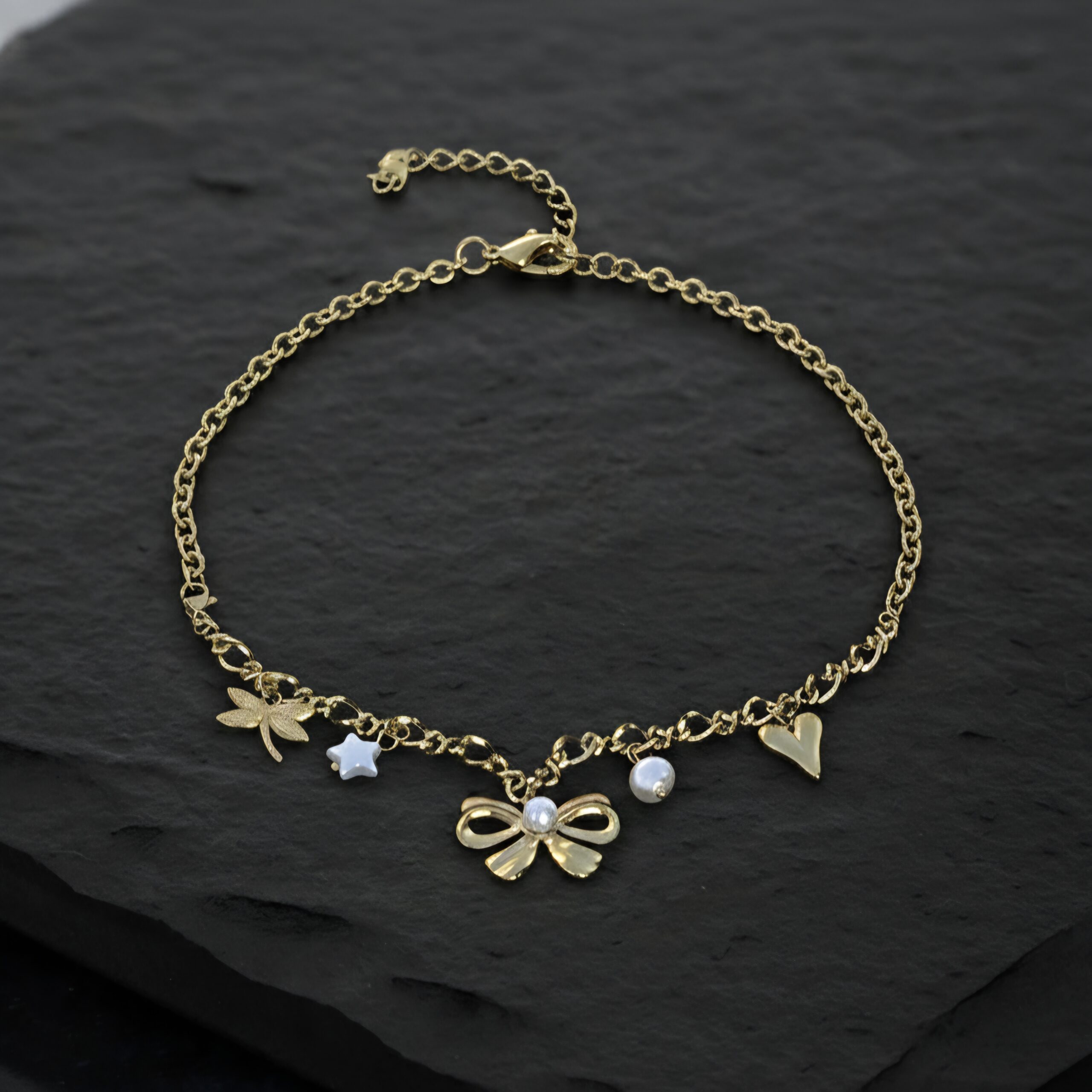 - Gold-tone chain with bow, heart, star & dragonfly charms