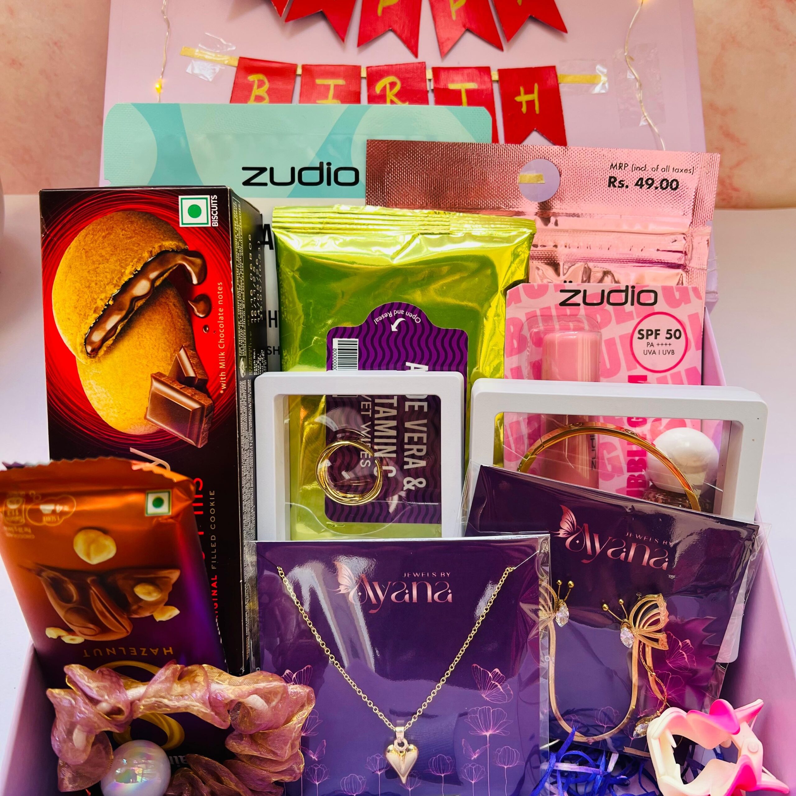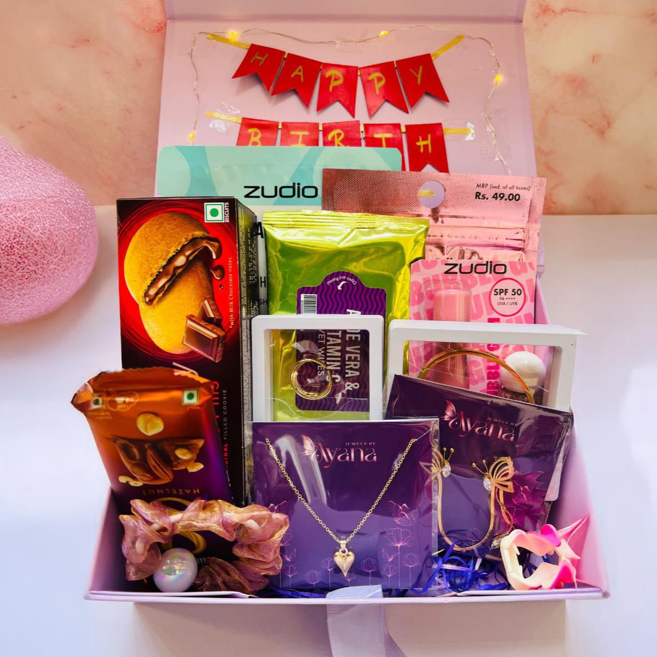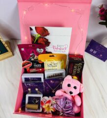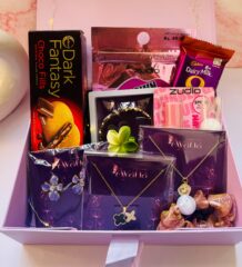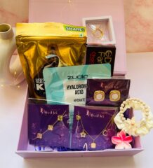 A thoughtfully curated mix of anti-tarnish jewellery, trending fashion accessories, beauty essentials, and sweet treats, designed to offer the perfect balance of style, self-care, and indulgence. This luxe hamper is ideal for modern women who love elegance with everyday usability.