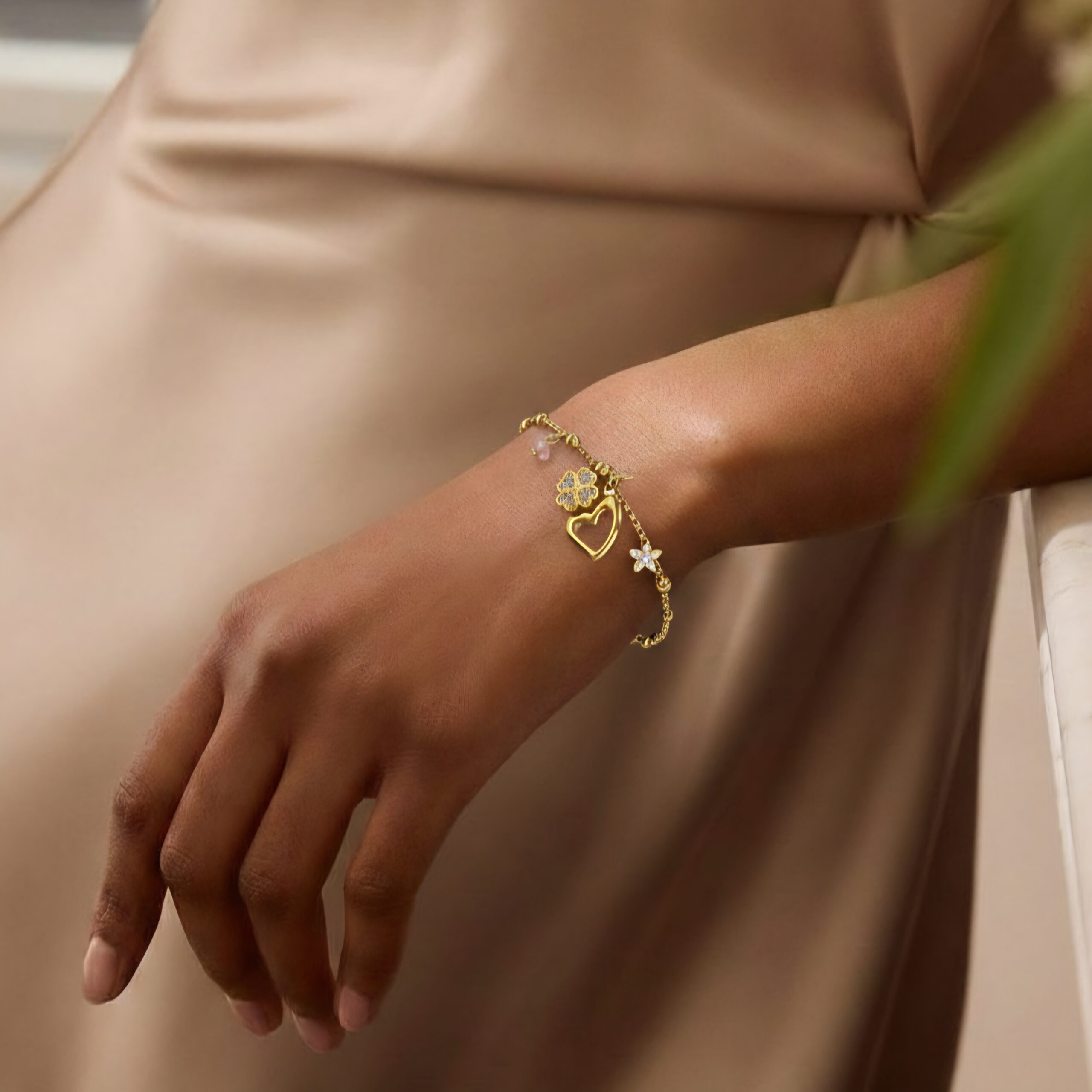 • Gold-tone chain with heart, clover & crystal charms