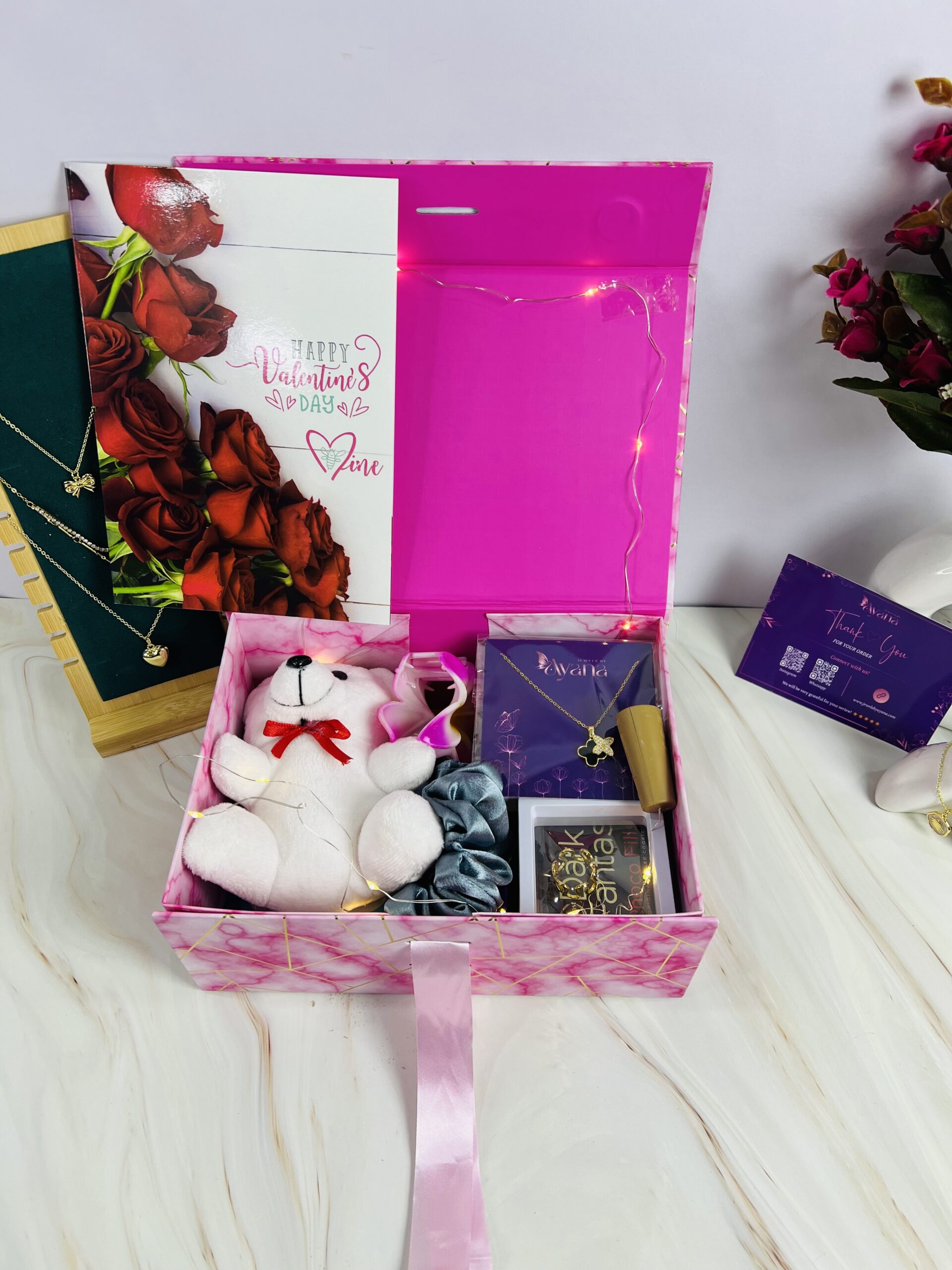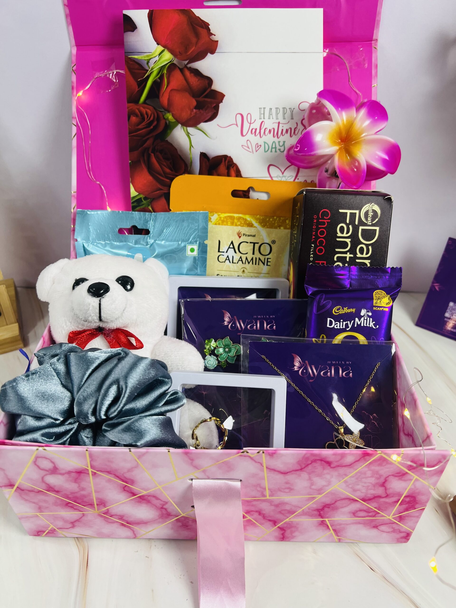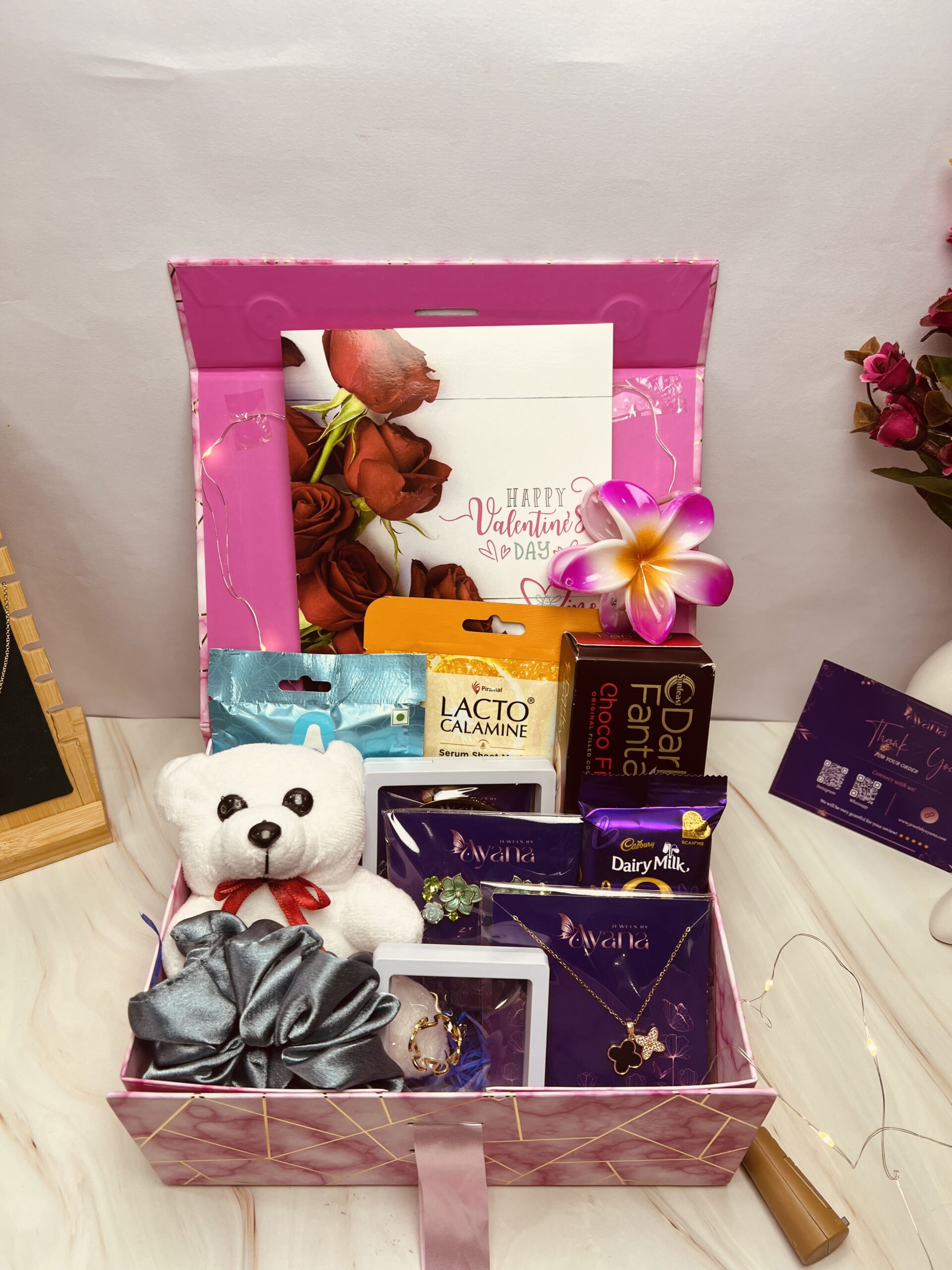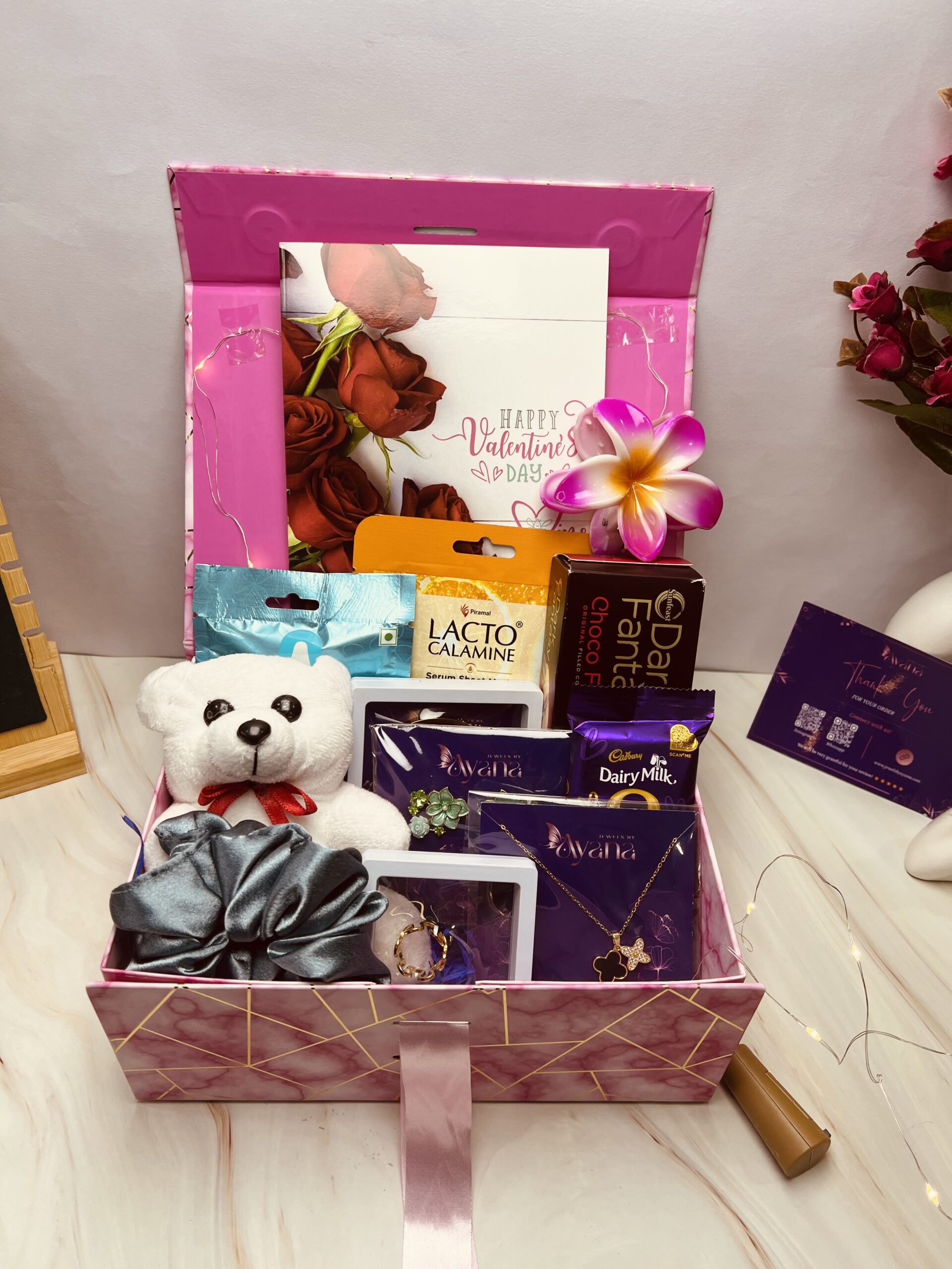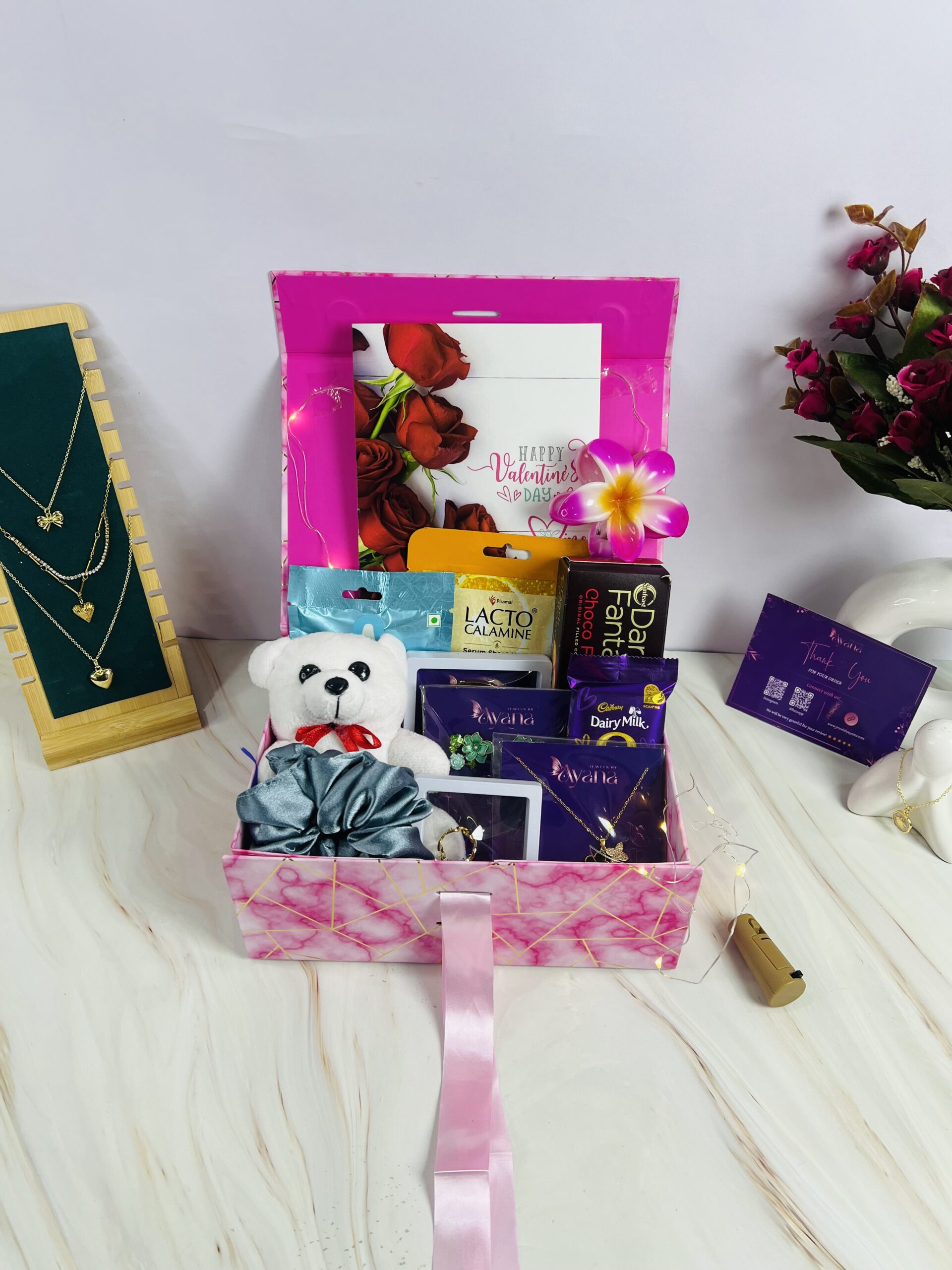A thoughtfully curated blend of elegant jewellery, adorable keepsakes, beauty essentials, and delightful treats, designed to create a perfect gifting experience. This luxe hamper combines style, self-care, and sweetness—making it an ideal choice for thoughtful gifting.