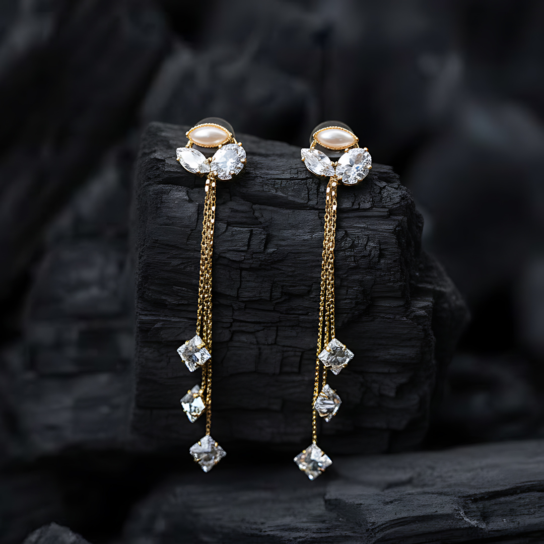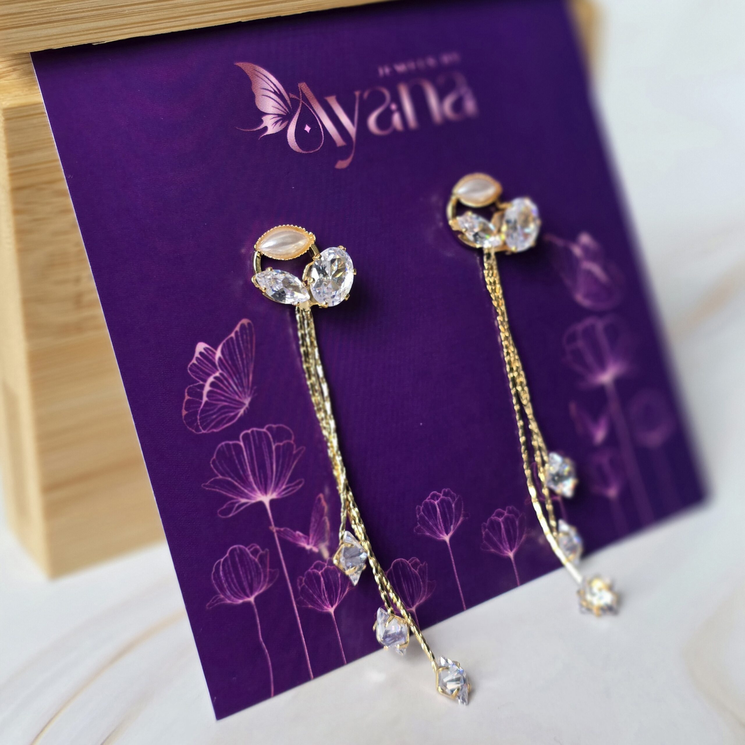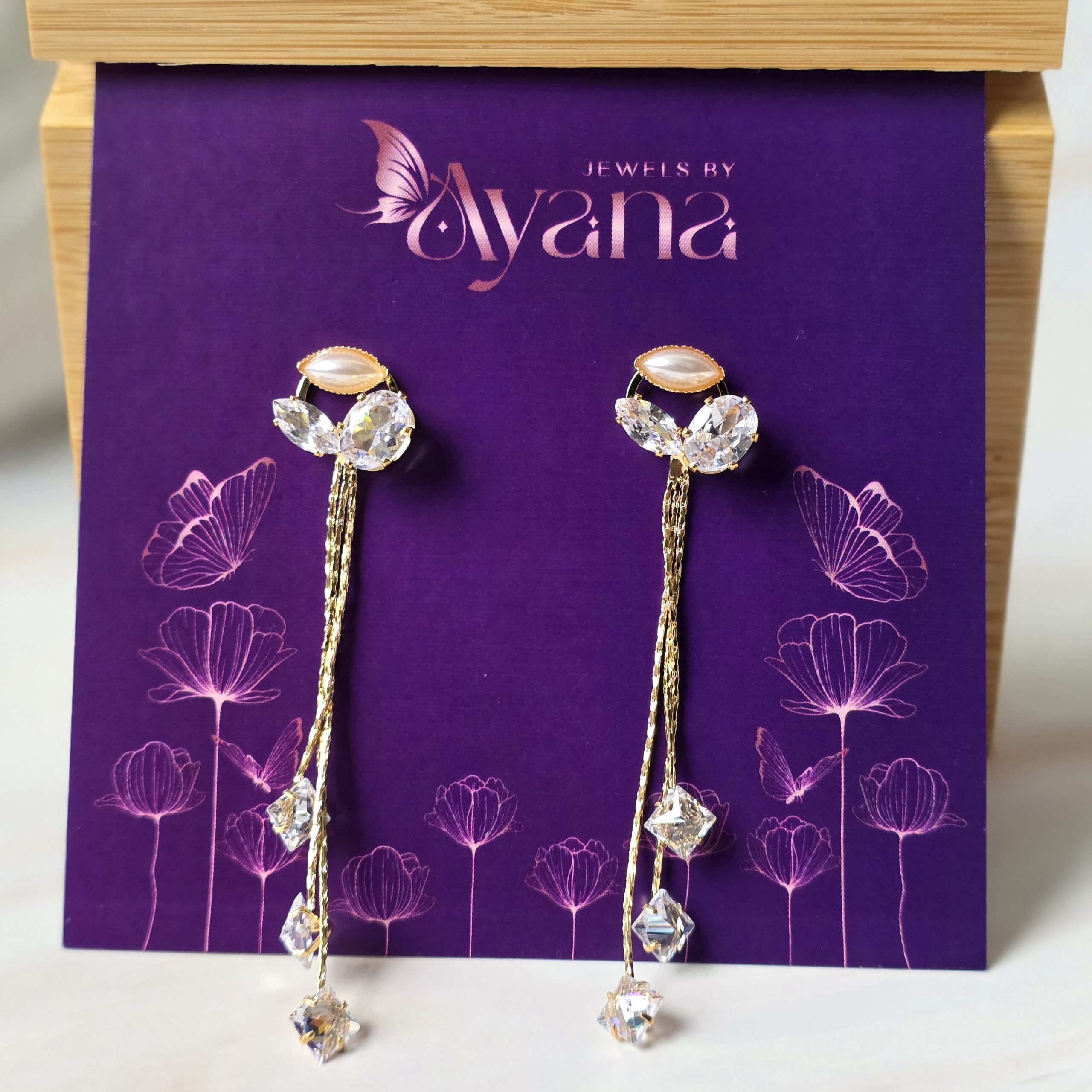 Luna Crystal Cascade Earrings are designed to reflect effortless elegance and graceful movement. Featuring a soft ivory-toned oval stud paired with sparkling crystal accents, these earrings flow into delicate gold-finish strands adorned with faceted crystal drops.