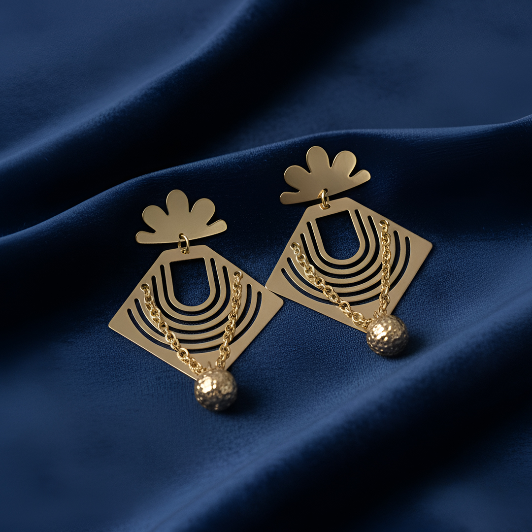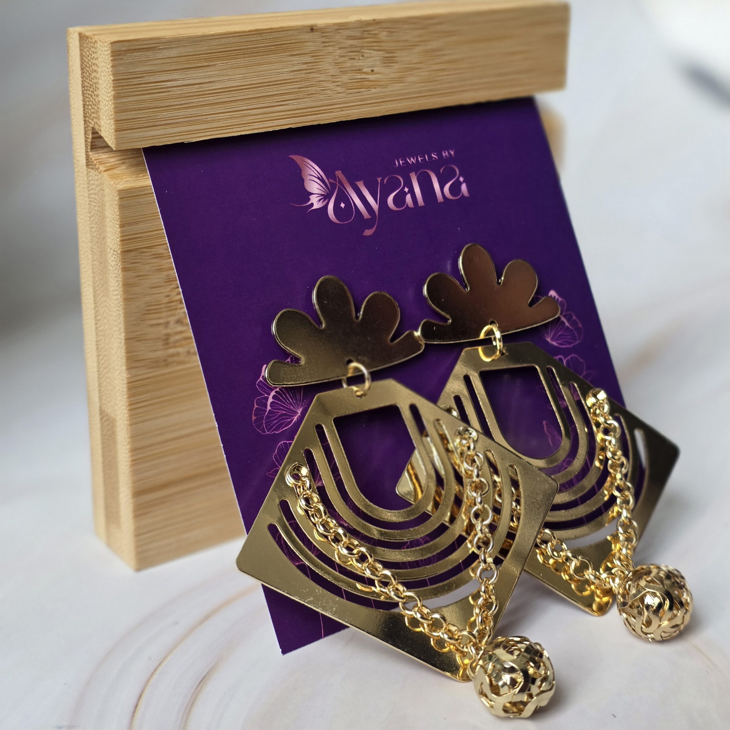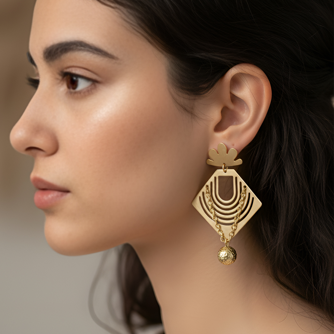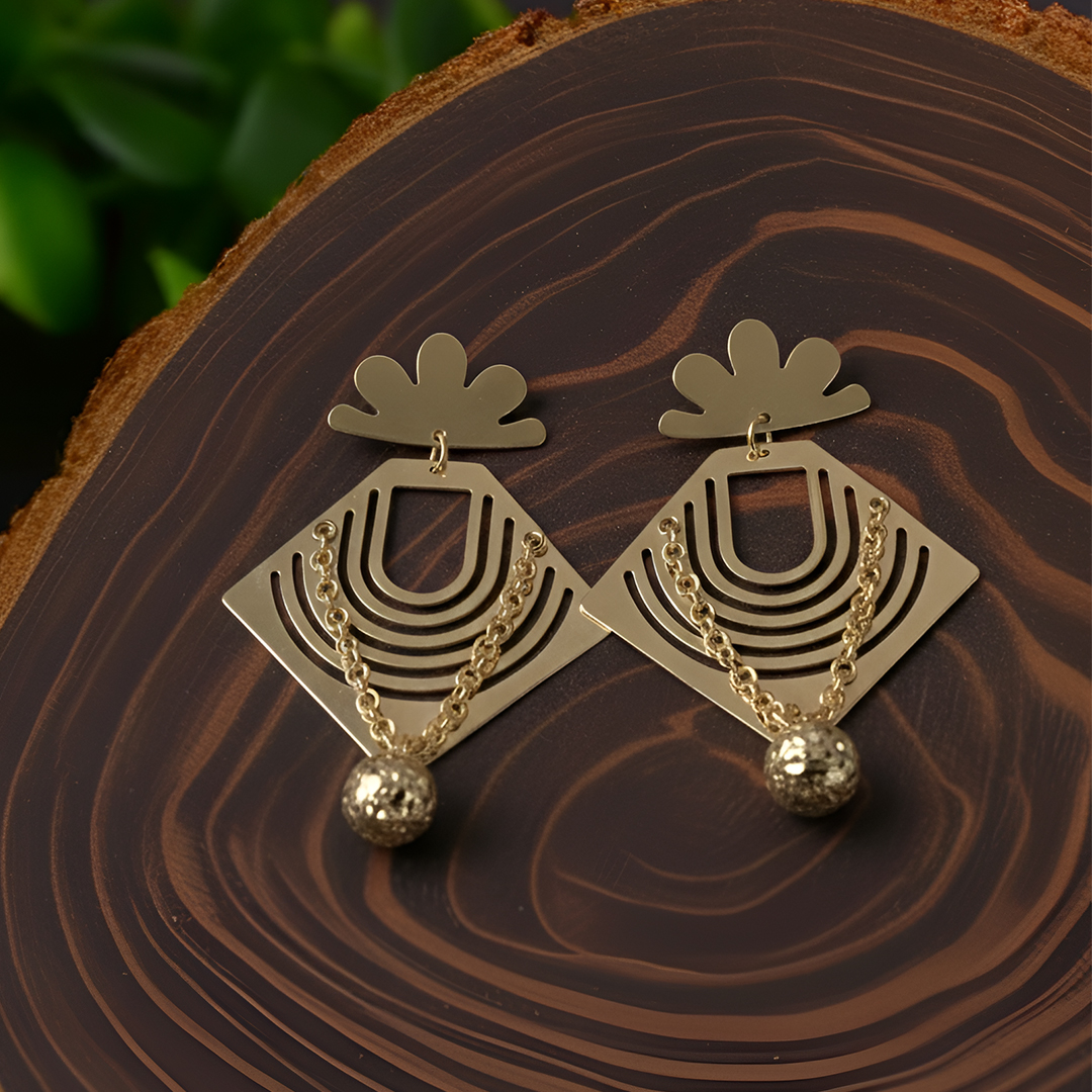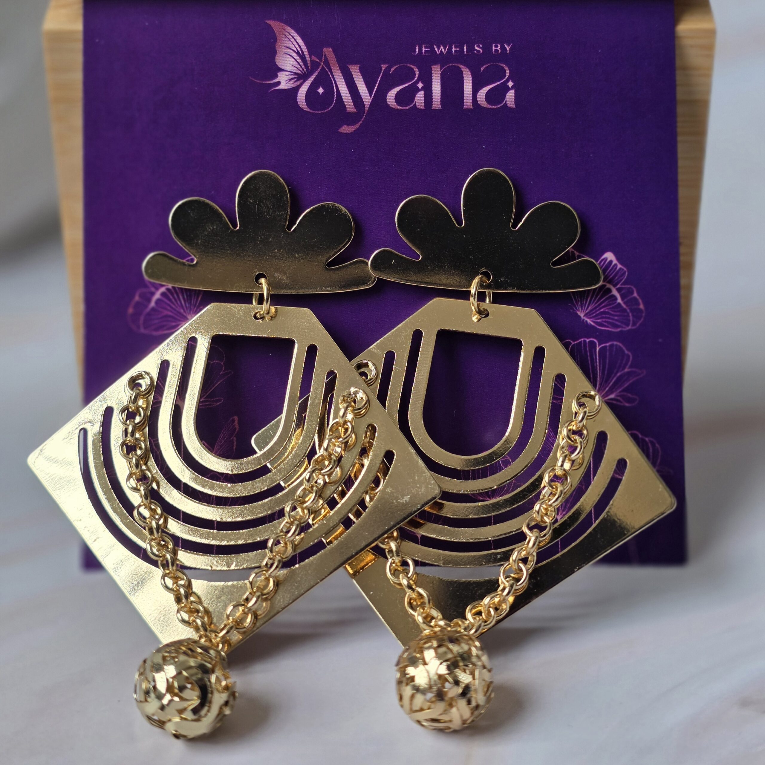 Aurelia Sculpted Statement Earrings feature a striking geometric design with layered gold-tone arches, creating a modern sculptural look. Accented with delicate chain detailing and a textured gold sphere drop, these earrings offer a perfect balance of structure and movement.