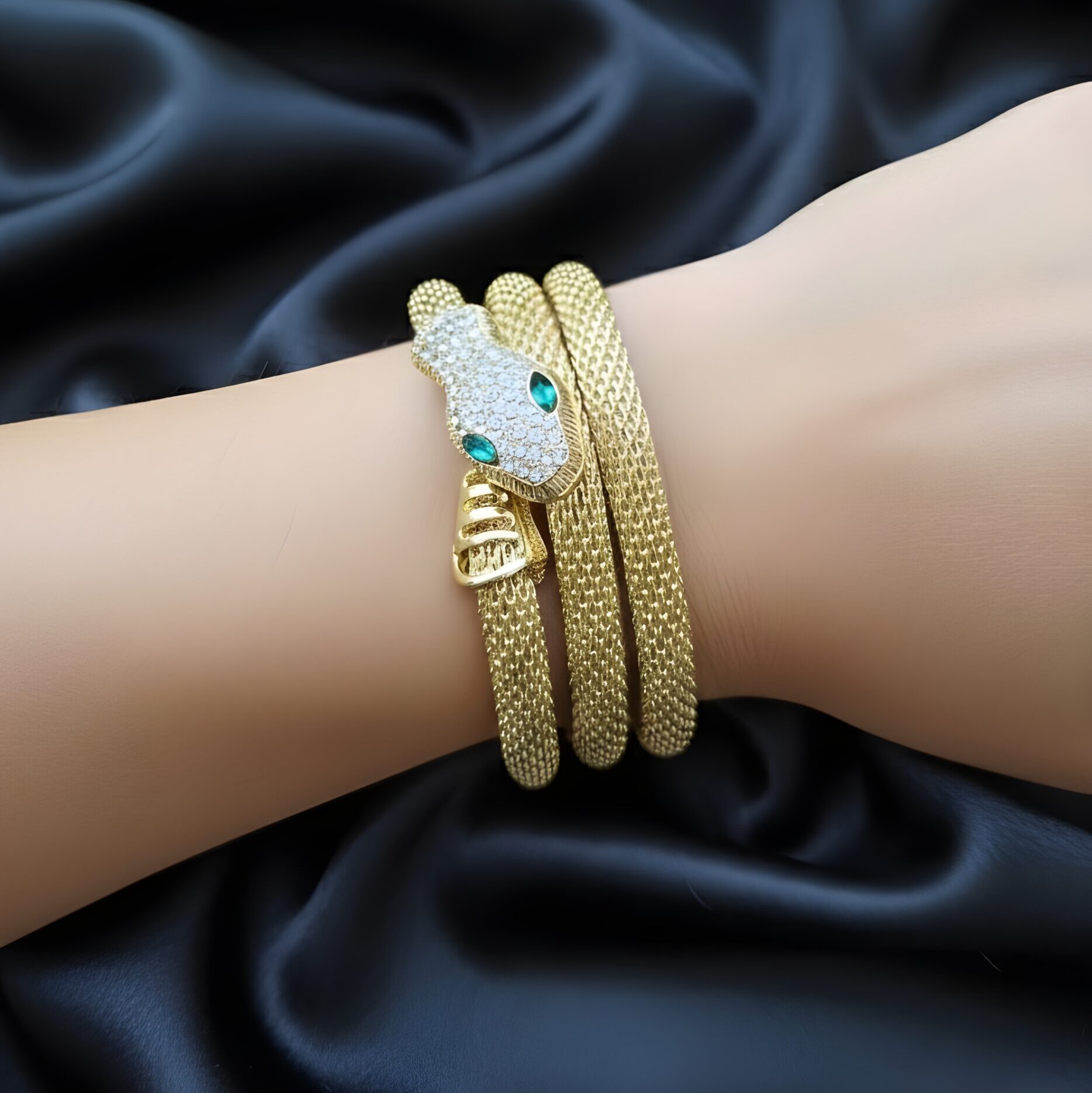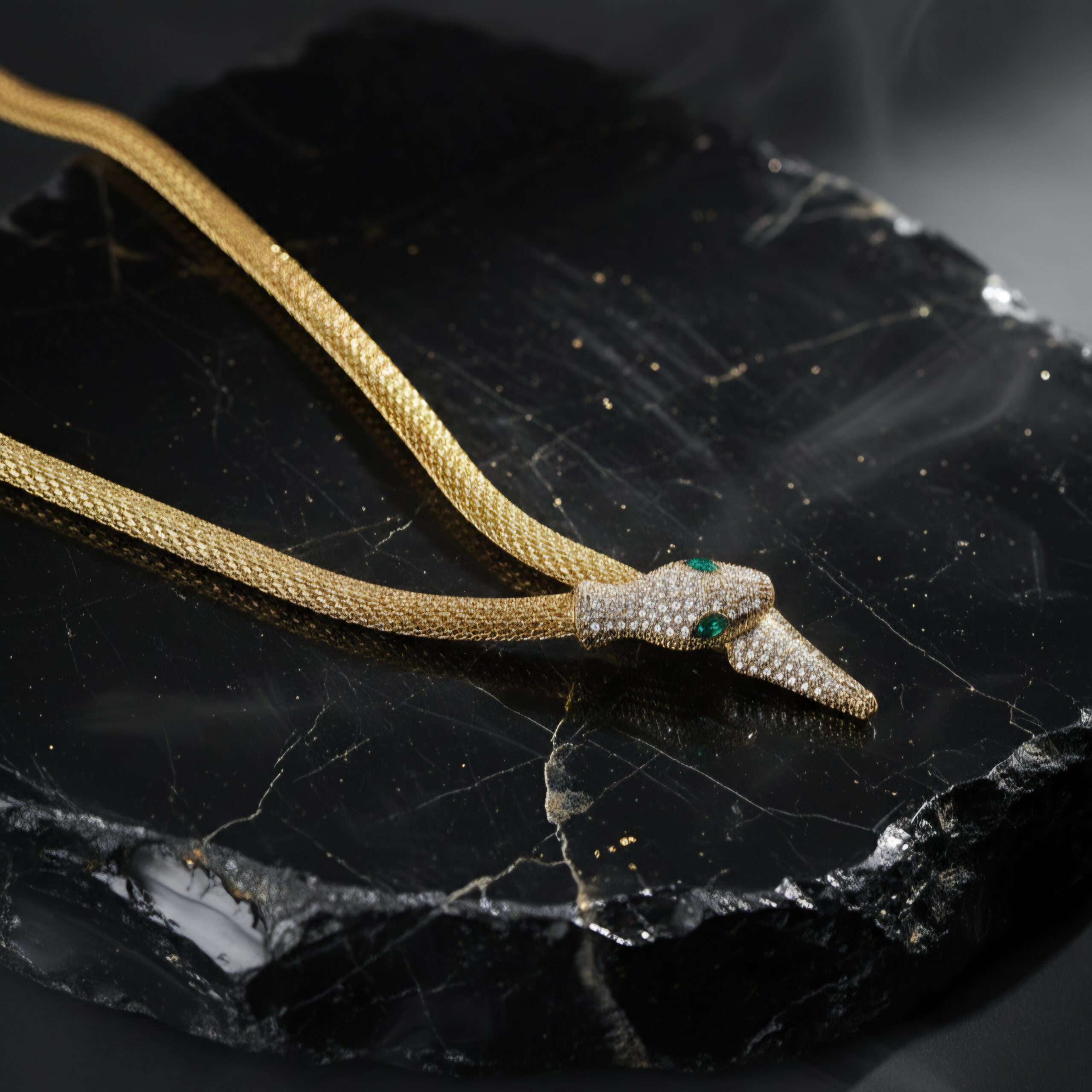 Zyra Serpent Lariat is a striking statement necklace inspired by the power and mystique of the serpent. Designed with a sleek gold-tone mesh chain, this piece features a crystal-encrusted snake motif highlighted by emerald-toned eyes that add depth and drama.
